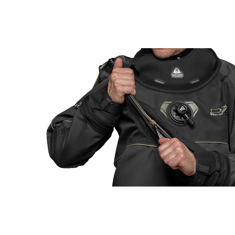 - Zamek błyskawiczny YKK/BDM – Długi, zakrzywiony zamek umiejscowiony na ramieniu ułatwia zakładanie skafandra, poprawiając jednocześnie komfort i swobodę ruchów górnej części ciała.